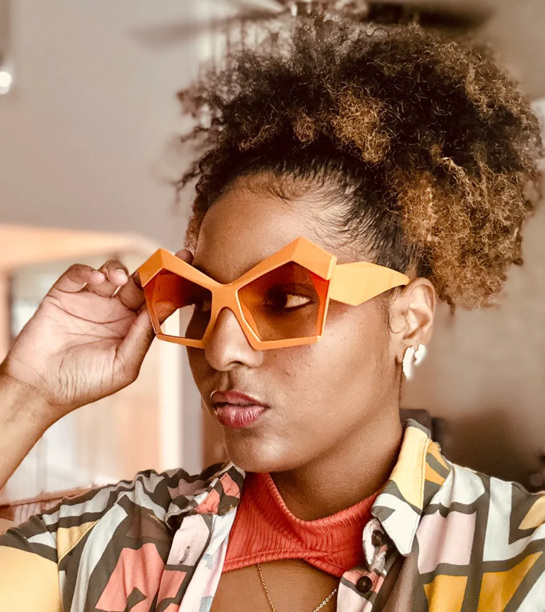 "Get ready to make a statement with Edna Fashion Glasses! These unique-shaped glasses are perfect for adding a touch of fun to your style. Not only do they shield your eyes from the sun, but they also show off your playful personality. Sun and fun never looked so good!"