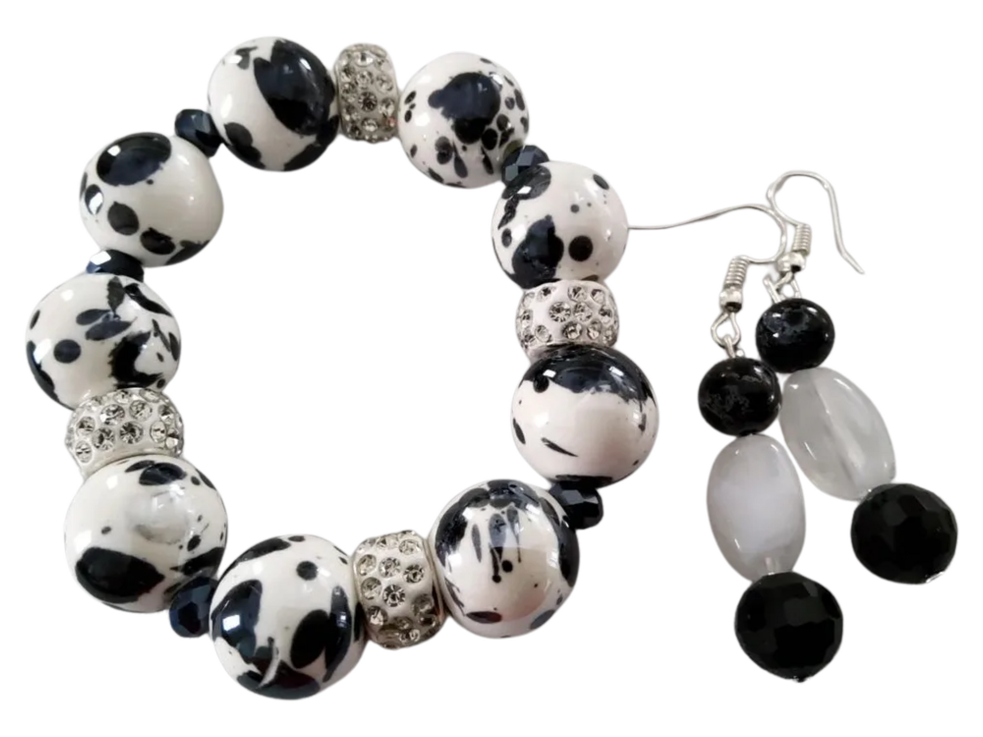 "Get ready to make some moo-ves with this stylish earring and bracelet set! You'll be the talk of the barnyard with its black and white design. Oh cow-m on, don't miss out on this one!"