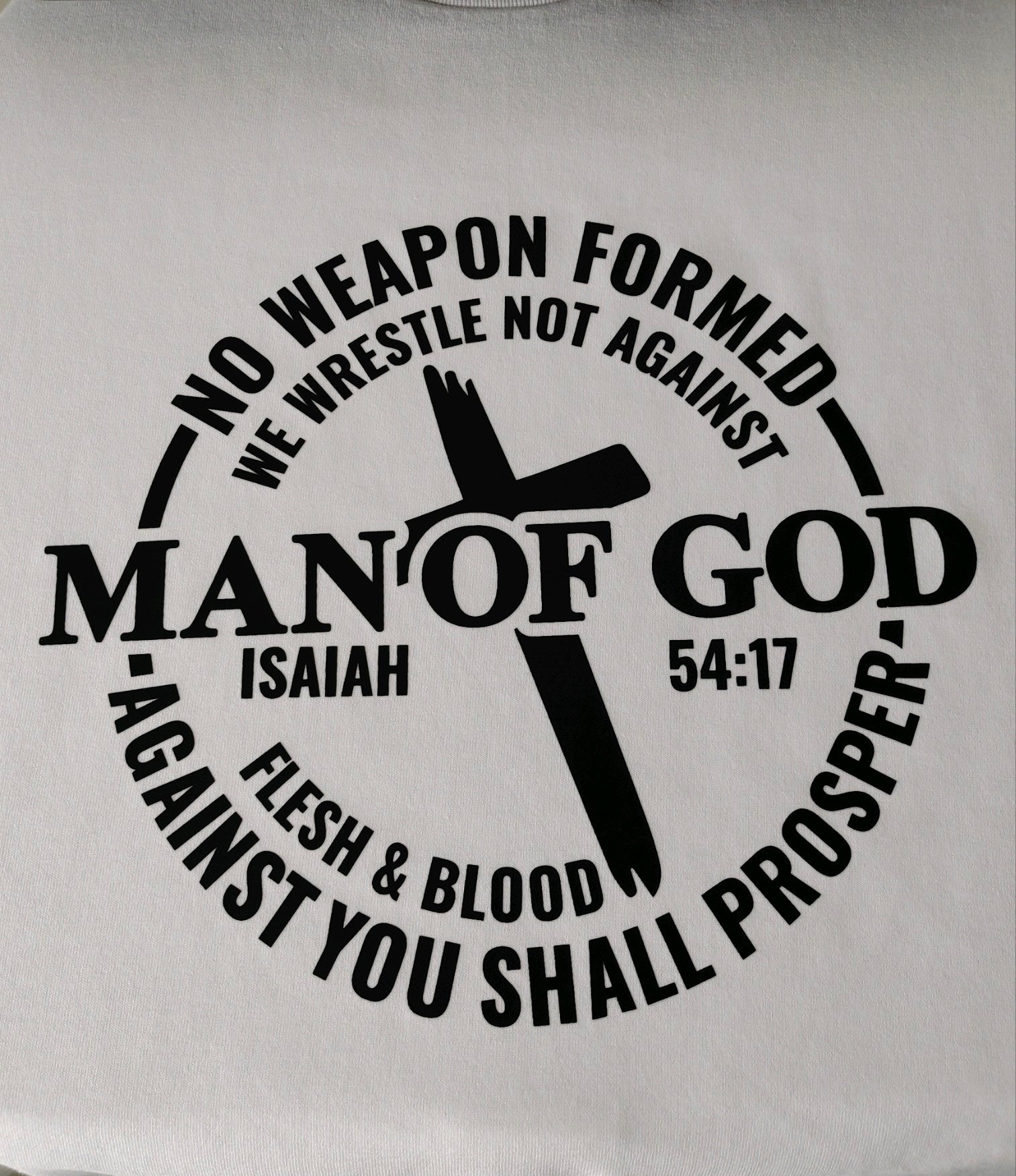 Be a powerful Man of God with our X-Large 100% cotton T-Shirt featuring Isiah 54:17. Stand tall and confidently in this shirt that boldly proclaims your faith and strength. Perfect for everyday wear and for sharing your beliefs with the world.