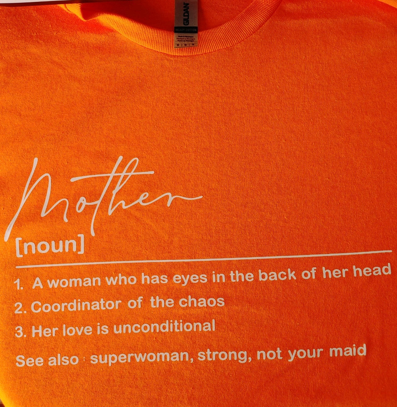 Be a standout mom in this bold Bright Orange Mother T-Shirt! Made from 100% cotton, it's super comfy and features a playful "Definition of a Mother" design. Perfect for any mom who doesn't take herself too seriously. (Only available in Medium.)