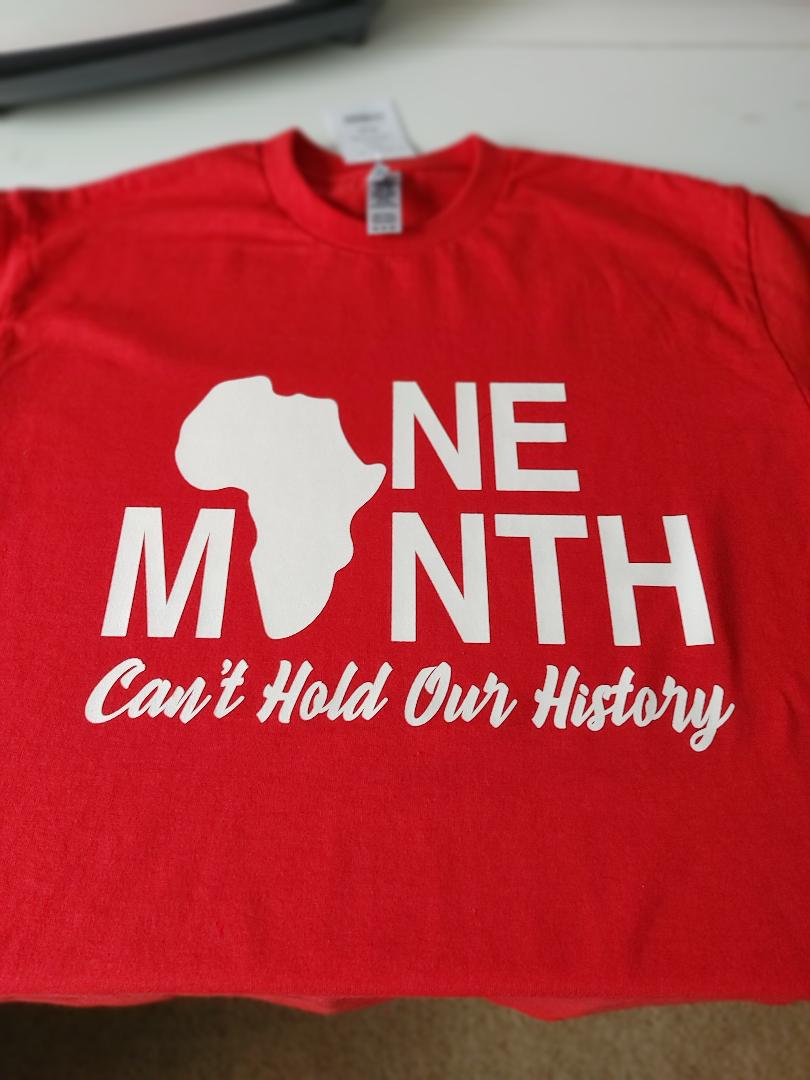 Experience the durability and comfort of the Red Gildan Medium T-Shirt. Its high-quality material can withstand even the busiest of schedules, making it perfect for those who are always on the go. Plus, with the statement "One month can't hold our history" printed on it, this shirt represents strength and resilience.